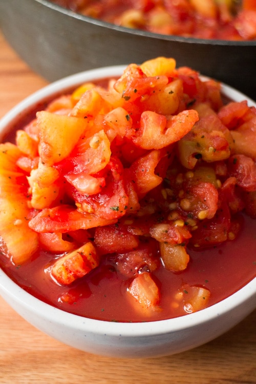 Stir the diced tomatoes and put in the pan, then put the remaining 1/4 teaspoon salt.