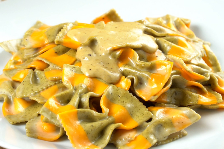 Farfalle bicolore crema parmigiano e funghi is a mouthwatering Italian pasta dish that combines al dente farfalle pasta with a creamy Parmigiano sauce and savory mushrooms. The two-tone farfalle pasta adds an element of visual interest to the dish, while the Parmigiano cheese and cream sauce provide a rich and indulgent flavor. The earthy mushrooms add a meaty texture and depth to the dish. This recipe is perfect for a cozy dinner at home or as a dish to impress dinner guests.